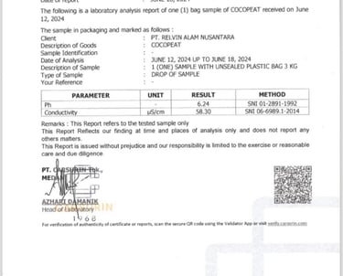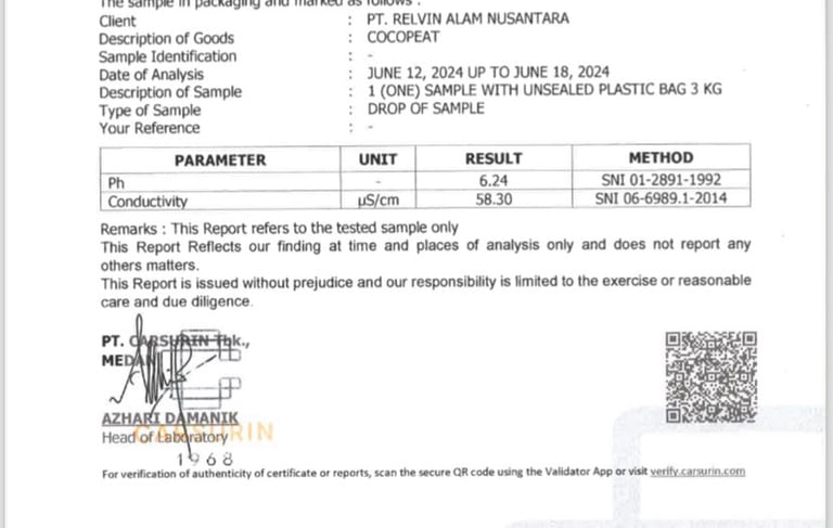 Tanamina cocopeat is produced under controlled processing and verified through laboratory testing to ensure consistent quality and reliable performance. Our cocopeat is capable of achieving very low EC levels, making it highly suitable for sensitive crops and professional cultivation systems, while EC specifications can be adjusted according to customer requirements. With stable particle structure, neutral pH, and controlled moisture content, Tanamina cocopeat delivers clean, uniform, and dependable growing media for a wide range of agricultural applications.